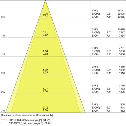De gradenbundel geeft informatie over hoe breed het licht wordt uitgestraald. Dit zit tussen de 0 en 360 graden (D). Hoe kleiner de hoek, hoe specifieker de lichtbundel is. Over het algemeen is een smalle gradenbundel perfect voor sfeer- of accentverlichting, terwijl een brede gradenbundel ideaal is om grote oppervlaktes te verlichten.